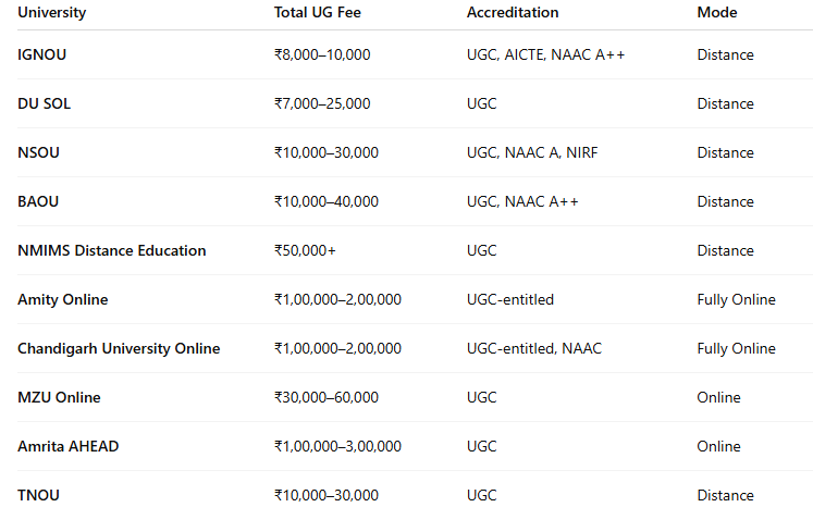 Budget-Friendly Options: IGNOU, DU SOL, NSOU, BAOU, TNOU offer low-cost UG programs (₹8K–40K total).